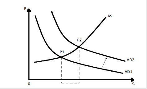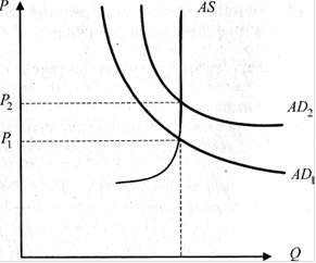 Рассмотрим ее механизм на графике модели AD -AS , где инфляция спроса отразится как смещение вправо и вверх кривой AD. На вертикальном (долгосрочном) отрезке кривой АS увеличение совокупного спроса от AD1 до AD2 повлечет за собой увеличение общего уровня цен от Р1 до Р2 при неизменном потенциальном выпуске Q (неизменном совокупном предложении).