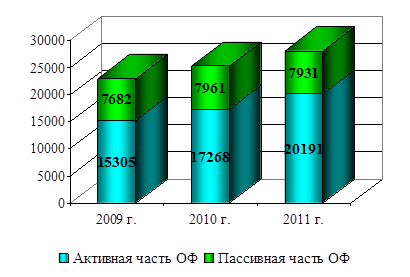 Анализ структуры основных фондов ОАО «Гурьевский пищекомбинат» с позиции их классификации на активную и пассивную части также указывает на наличие положительной динамики. Удельный вес активной части основных фондов комбината увеличился в рассматриваемом периоде с 66,% в 2009 г. до 71,8% в 2011 г.