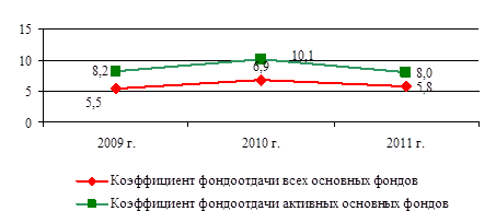Динамика показателя фондоотдачи активной части основных фондов выглядит аналогичным образом: в 2009 г. - 8,23 руб./руб.; в 2010г. - 10,05 руб./руб.; в 2011 г. - 8,04 руб./руб. Необходимо отметить, что в 2011 г. показатель фондоотдачи активной части основных фондов ОАО «ГПК» ниже на 0,1 пункта, по сравнению с уровнем 2009г.