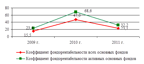 Аналогично для показателя фондорентабельности активной части основных фондов: 2009г. на 1 руб. стоимости активной части основных фондов было получено 0,234 руб. чистой прибыли; в 2010 г. - 0,686 руб./руб.; в 2011 г. - 0,322 руб./руб.