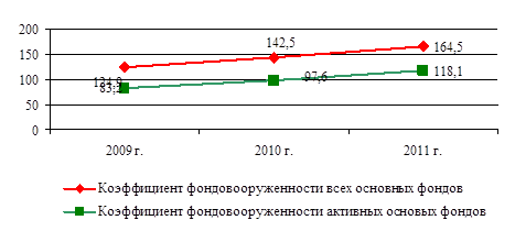 Аналогичная ситуация с фондовооруженностью активной части основных фондов: в 2009 г. - 83,2 тыс. руб./чел.; в 2010 г. - 97,6 тыс. руб./чел.; в 2011 г. - 118,1 тыс. руб./чел.