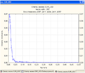 Обычно для вычисления оценок спектральной плотности периодограмму сглаживают, чтобы убрать случайные колебания. Вид взвешенного скользящего среднего и ширина окна сглаживания выбирается в окне Спектральные окна, которое находится в закладке Дополнительно. Для рассматриваемого примера установим 5-точечное окно Хэмминга (Окно Хэмминга - для каждой частоты веса для взвешенного скользящего среднего значений периодограммы определяются как