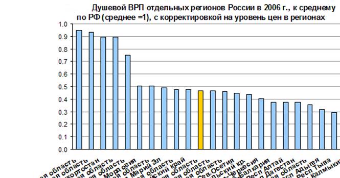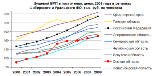 По уровню экономического развития Омская область относится к среднеразвитым регионам, ее душевой ВРП примерно на четверть ниже среднего по регионам РФ. Область уступает промышленно развитым регионам Сибири - Красноярскому краю, Томской, Кемеровской и Иркутской областям (рис. 3).