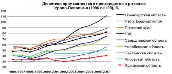 Экономические проблемы области обусловлены сохраняющимся кризисом промышленного производства, которое едва превысило 40% от уровня 1990 г. (рис. 2). В результате на долю промышленности приходится лишь 19% ВРП, на сельское хозяйство - 15%, повышена доля транспорта и связи (17%) и нерыночных услуг государства (около 20%).
