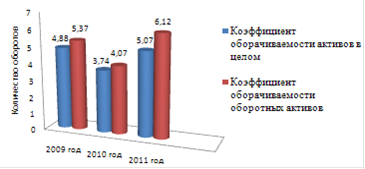 Динамика показателя оборачиваемости по итогам трёх отчетных периодов сложилась следующим образом. На 31 декабря 2010 года по сравнению с 2009 годом, показатели оборачиваемости ухудшаются: коэффициент оборачиваемости оборотных активов уменьшается на 1,3 оборота (4,07 - 5,37), при этом продолжительность одного оборота возрастает на 21 день (88 - 67). На 31 декабря 2011 года в сравнении с 2010 - ситуация оборачиваемости нормализируется: рост показателя оборачиваемости оборотных активов составил 2,05 оборота и сокращение оборота составило 29 дней.