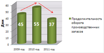 Сохранение такой же динамики показателя продолжительности оборота производственных запасов в дальнейшем, может положительно сказаться на объеме выпускаемой продукции, на выручке от её реализации, и, как следствие, на росте прибыли и финансовом состоянии организации в целом.