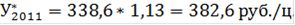По этому прогнозу себестоимость зерна на исследуемом предприятии в 2011 году будет равнять 382, 6 руб. /ц.