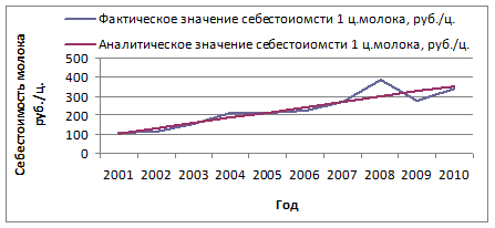 Рис. 3. Аналитическая модель тренда вместе с фактическим уровнем динамики себестоимости 1 ц. зерна ЗАО "Куликовское" за 2001-2010 гг.