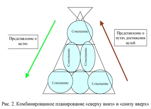 Процесс планирования, в котором на предприятии участвует множество лиц, осуществляется, как правило, комбинированно сверху вниз и снизу вверх в соответствии с так называемым принципом встречного потока. Представители как минимум двух уровней управления должны согласовать свои цели и представления о путях их достижения в ходе многократно повторяющихся совещаний (плановых конференций), являющихся основой формирования и утверждения плана (рис. 2).