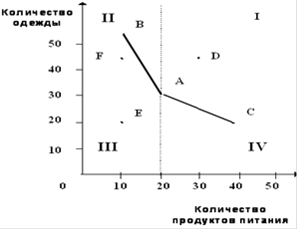 В нашем примере набор А более предпочтителен, чем набор Е (по трем предпосылкам анализа), набор D более предпочтителен, чем набор А. Набор А легко сравнивать с наборами : в области Iболее предпочтительные, по сравнению с А наборы, а в области III- менее. По поводу точек в областях II иIVнеобходимо дополнительное исследование.Сравнение А с наборами B, F, C возможно только на основе информации об их оценке конкретным потребителем. Наш потребитель одинаково оценивает наборы А, В и С. Но тогда F - менее предпочтительный набор.