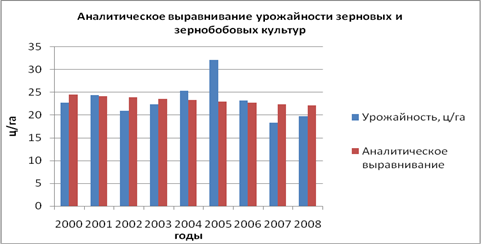 =23,3-0,3t. Параметр a1 показывает ежегодное увеличение (уменьшение) изучаемого явления. Ежегодно в течение изучаемого периода (2000-2008) средняя урожайность зерновых и зернобобовых культур сокращалась на 0,3 ц/га. Таким образом, получили выровненный ряд урожайности, который говорит о систематическом спаде с годовым сокращением в 0,3 ц/га. Полученные данные, изобразим графически (Рис.4).