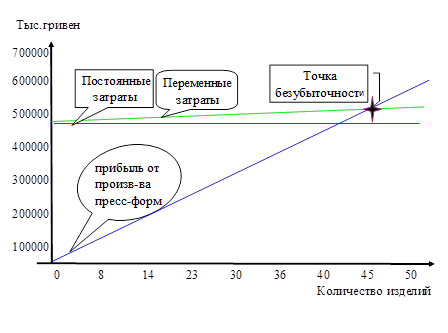 Из графика видно, что если организовать работу участка в две смены и довести выпуск пресс-форм до 45 единиц в год, то мы перекроим даже постоянные затраты участка. Но поскольку наши постоянные затраты включены в основное производство, мы можем с успехом конкурировать на рынке пресс-форм и даже диктовать ценовую политику своим конкурентам в борьбе за клиента.