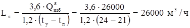 Расчет значения LСГ ведут по избыткам явной или полной теплоте, массе выделяющихся вредных веществ, избыткам влаги (водяного пара), нормируемой кратности воздухообмена и нормируемому удельному расходу приточного воздуха. При этом значения LСГ определяют отдельно для теплого и холодного периода года при плотности приточного и удаляемого воздуха r = 1,2 кг/м3 (температура 20 °С).