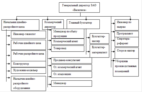 Организационная структура ЗАО «Василиса» имеет линейно-функциональный принцип построения и характеризуется тем, что первому руководителю в разработке конкретных вопросов и подготовке соответствующих решений, программ, планов помогает специальный аппарат управления, состоящий из функциональных подразделений. Такие подразделения проводят свои решения либо через высшего руководителя, либо прямо доводят их до специализированных служб или отдельных исполнителей на нижестоящем уровне.