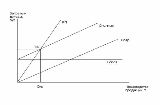 Тб, Qкр - точка безубыточности или точка критического объема. В точке безубыточности у предприятия нет ни прибыли, ни убытков.