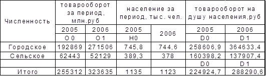 Из полученных данных видно, что средний товарооборот на душу населения увеличится на 28,1% (128,1-100%), в том числе за счет роста товарооборота на душу городского и сельского населения на 27,8%. Под влиянием сдвигов в структуре населения он незначительно возрос на 0,2%.