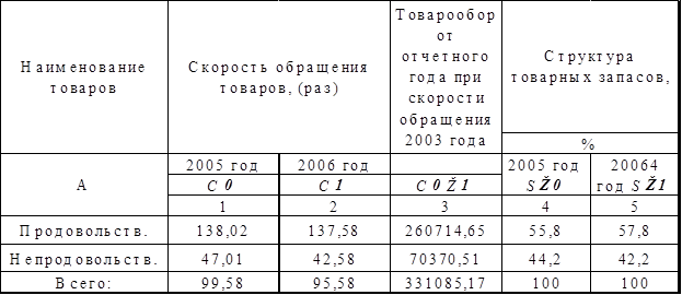 Скорость обращения всех товаров в облпотребсоюза уменьшилась в 2006 году по сравнению с 2005 на 4,01%, или на 3,99 раза (95,59-99,58). Это уменьшение обусловлено изменением скорости обращения отдельных товаров и структурными сдвигами в запасах.