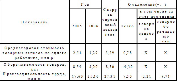 Влияние товарных запасов и товарооборачиваемости на производительность труда работников торговли по Гродненскому облпотребсоюзу за 2005-2006 гг. (в сопоставимых ценах)