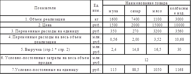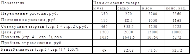 Таким образом, при объеме реализации муки в количестве 1600кг, по цене 1500 руб., выручка составит 2,4 млн. руб.; сахара в количестве 7400 кг, по цене 2000 руб., выручка составит 14,8 млн. руб.; мяса в количестве 1100 кг, по цене 15000 руб., выручка составит 16,5 млн. руб.; колбасных изделий в количестве 3000 кг, по цене 10000руб., выручка составит 30 млн. руб. Переменные расходы на весь объем реализации составит 16,76 млн. руб. На один рубль, затраченный на покрытие переменных затрат, приходится 33,5% постоянных расходов (7 млн. руб. / 16,76 млн. руб. * 100%). Определим рентабельность продаж и сумму прибыли при вышеизложенных условиях реализации (табл. 2.3.2)