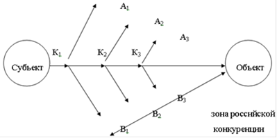 где К1, К2, К3 - вектор российской конкуренции К1 < К2 < К3; А1, А2, А3 - вектор удовлетворения потребности А1 < А2 < А3; В1, В2, В3 - вектор соперничества В1 < В2 < В3