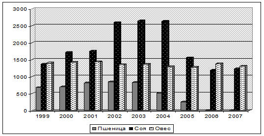 В 2007 г. наблюдается небольшое увеличение валового сбора сои по сравнению с 2006 г. - на 13 процентов или на 144 ц., но по сравнению с 2005 г. - уменьшение валового сбора на 21 процент или на 330 ц. Урожай овса также увеличился в 2007 г. на 2 процента или на 27 ц по сравнению с 2005 г.