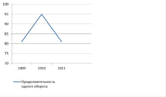 Из расчетов видно, что длительность одного оборота наибольшая в 2010 г, а в 2009 и 2011гг она одинаковая. То есть к 2010 году произошло замедление оборачиваемости оборотных средств, а затем она снова повысилась до первоначального уровня.