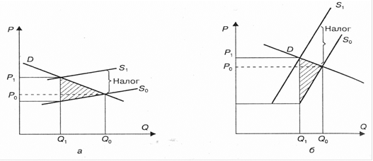 Рассмотрим распределение налогов при спросе эластичном и неэластичном. Эластичность предложения в данном случае будет являться величиной постоянной. На рис. 2.2 показано графически, как введение налога повлияет на цену и объем продаж товара.