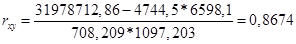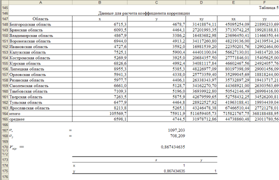 При расчете в MS Excel по данной функции был получен результат 0,8674, т.е. связь между денежными доходами и потребительскими расходами тесная, фактически 75,24% (0,8674*0,8674*100%) вариации потребительских расходов объясняется вариацией денежных доходов. А 24,76% составляет влияние неучтенных в модели факторов.