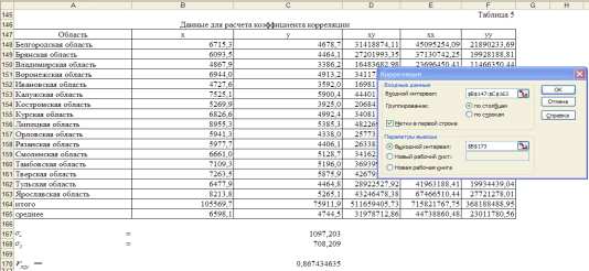 Коэффициент корреляции может быть найден с использованием анализа данных: Анализ данных ®Корреляция