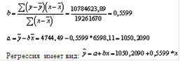 В результате применения функции ЛИНЕЙН получены два значения 0,5599 и 1050,2090, которые соответственно представляют собой значения b и а.