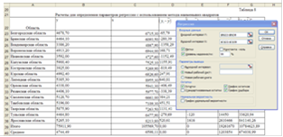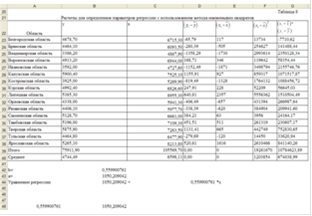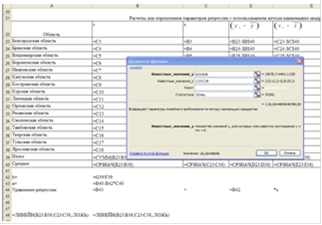 Рисунок 7. Результаты расчета параметров уравнения с использованием функции ЛИНЕЙН