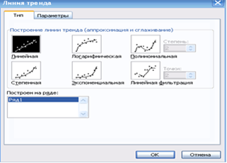В MS Ехсеl линия тренда может быть добавлена в диаграмму с областями гистограммы или в график. Для этого: 1) выделим область построения диаграммы; в главном меню выберем Диаграмма/Добавить линию тренда; 2) в появившемся диалоговом окне (рис. 13) выбираем вид линии тренда и задаем соответствующие параметры.