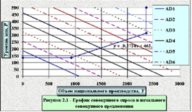 График совокупного спроса AD для первого (базового) периода строится на основе данных таблицы 2.0. При построении графика AD для последующих периодов необходимо учитывать, что в каждом из них совокупный спрос увеличивается на 400 млрд. руб. (параметр m увеличивается на 400 млрд. руб.).