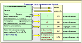 где Y - доход (национальный доход), млрд. руб./мес.;- выплачиваемые налоги, млрд.руб./мес.;- предельная склонность к потреблению (b=0,71 руб./руб.);- автономное потребление (a=115 млрд.руб./мес.).