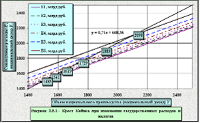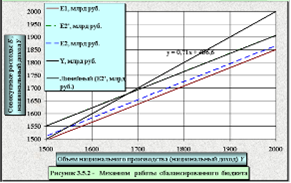 На рисунке 3.5.2 изобразим четыре графика: Y=f(Y) и три графика расходов Е: для первого и второго периодов (сбалансированный госбюджет), промежуточный вариант с увеличенными госрасходами и базовыми налогами.