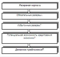 Изменяя норму обязательных резервов, Национальный банк может косвенно воздействовать на денежное предложение в экономике следующим образом :