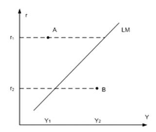 Если экономика описывается точкой справа (снизу) от кривой LM, то можно говорить об избыточном спросе на деньги. В точке В люди хотят иметь больше денег, чем у них есть. Для этого они будут продавать облигации, тем самым снизится их цена и повысится процентная ставка. Этот процесс будет продолжаться до тех пор, пока процентная ставка не повысится до равновесного уровня, определяемого точкой на кривой LM [6, с. 160].