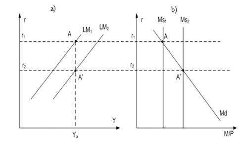 На рисунке 2b изображены кривые спроса Md и предложения денег Ms1, а точка их пересечения (точка A) определяет первоначальный уровень процентной ставки r1. Предположим, что центральный банк увеличивает предложение денег, покупая ценные бумаги на открытом рынке. При фиксированном уровне дохода рост количества денег сдвигает кривую предложения денег в положение Ms2, а равновесная ставка процента падает до уровня r2. На рисунке 2a снижение равновесной ставки с r1 до r2 соответствует смещению равновесия из точки А в точку А’ и перемещению кривой из положения LM1 в положение LM2 (ниже и правее).