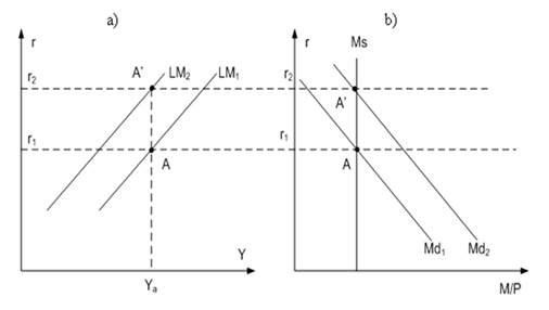 На рисунке 3 сдвиг кривой LM обусловлен изменением спроса на деньги по экзогенным причинам при заданном уровне цен и фиксированном объеме выпуска на уровне Ya.