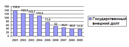 Так, данные показывают, что государственный внешний долг значительно сократился с 2005 г. по 2008 год. С 2001 года по 2008 год его сокращение составило более 70%, а в абсолютном выражении - 98,3 млрд. дол. США. В 2009 году его снижение составило 7,5%.