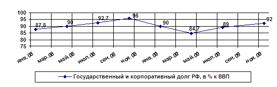Данные диаграммы свидетельствуют, что совокупный национальный долг с апреля 2009 года по конец 2009 года значительно вырос к уровню ВВП страны и составил 92% вместо 84,7%.