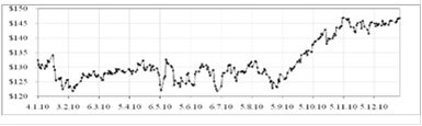 Рассматривается временной ряд, составленный из 252 значений цены акции IBM (приложение А), взятых за год, за период с 4 января 2010 г. по 31 декабря 2010 г. Значения являются ежедневными, в неделе 5 дней торгов.