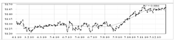 Рассматриваемый ряд данных характеризуется нестабильной тенденцией. Ряд содержит значительное количество мелких скачков. Динамика представляет собой три периода развития. В начальный период цена интенсивно колеблется и имеет среднее значение около 127$, во втором периоде на протяжении двух месяцев с 6 сентября по 5 ноября цена стремительно растет, несмотря на один резкий скачок 18 октября. Цена становится достаточно стабильной без резких "перепадов" (около 146$) только в третий период, приходящийся на последний месяц.