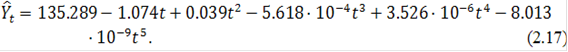 , т.е. временной ряд не содержит стабильной тенденции и необходимо построение кусочно-непрерывной модели. Вначале рассмотрим первую подвыборку и построим для нее модель, наилучшим образом аппроксимирующую полученные значения к исходному ряду. Изобразим на графике данную подвыборку и построенную трендовую модель, которая является полиномиальной моделью 5 степени (рисунок 2.11).