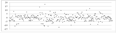 и являются своего рода выбросами, резко выделяющимися на фоне общей картины остатков, что, возможно, вызвано неточностью в вычислениях. Поэтому отклонить или принять гипотезу о нормальном распределении остатков затруднительно. Применяя статистику Жака-Бера, предварительно вычислив коэффициенты асимметрии и эксцесса, установили, что гипотеза о нормальном распределении остатков отклоняется, поскольку значение статистики ![]()