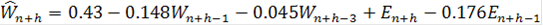 Таким образом, основываясь на полученных результатах (3.12), лучший прогноз получен по модели (3.9). Несмотря на то, что при сравнении моделей наиболее точно описывающей исходный ряд оказалась модель (2.13), прогноз с ее использованием дал худший результат.