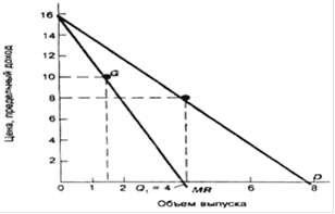 Согласно равенству, которое приведено выше, предельный доход от первой единицы выпуска продукции всегда равняется цене данной единицы, т.к. в данной ситуации нет «первоначального выпуска»7 , приносящий меньший доход в результате снижения цены, которое необходимо для увеличение спроса. Но после того как 1 единица продана, предельный доход становится ниже цены, поскольку в этом случае имеются оба эффекта, которые были описаны в равенстве.