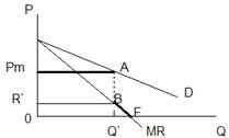 Если объем выпуска монополиста меньше Q`, то действует установленная государством цена Pm, кривая спроса представлена горизонтальной линией и является абсолютно эластичной (dP/dQ=0). Следовательно, MR=P.