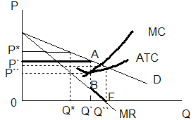 Если объем производства превышает Q`, то дополнительное количество продукции может быть продано лишь по более низким, чем Pm, ценам. Кривая спроса является убывающей, dP/dQ<0, и следовательно, кривая предельного дохода MR лежит на cегменте BF. При объеме производства, равном Q`, кривая предельного дохода имеет разрыв AB.