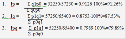 Выводы: В отчётном периоде цена I вида продукции увеличилась на 9.37%, на II вид продукции увеличилась на 10%, на III вид продукции уменьшилась на 25.37%.